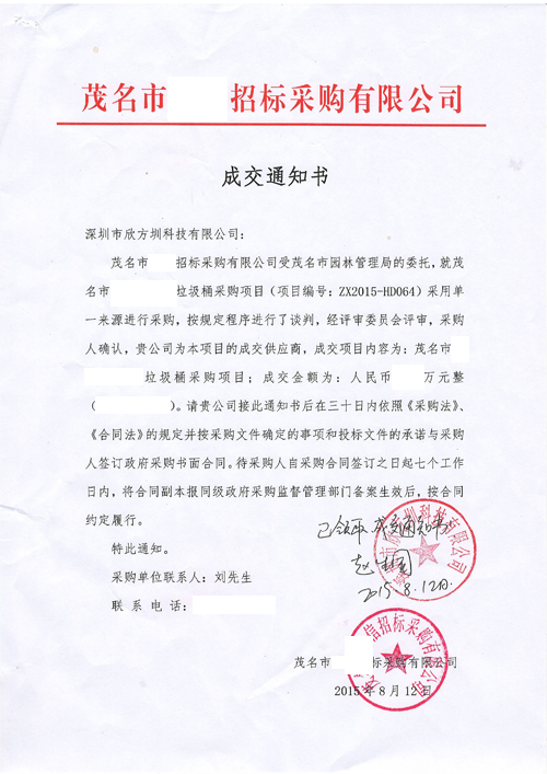 欣方圳擁有專業的5到10人的招標小部門工程,負責收集全國各地市政單位的招標信息。完整的招標流程,從咨詢,報名,核算成本,派遣核心部門業務人員參與競價投標。茂名市的競標招標,可謂是一波三折,驚心動魄。得知茂名有競價投標,仿大理石垃圾桶需求500個左右,金額達到幾十萬。欣方圳派遣了兩名業務人員,一名是業務經理,一名是業務員。開著欣方圳公司的公用車輛,火速趕往茂名投標。參與惡性價格競爭投標,業務人員核算成本不馬虎,必須得精確到位。事先準備打印出來的一頁,一頁的標書,疊在一起,用特制膠水把它整理整一本書籍。書籍完整后還得,一頁,一頁的紙上蓋上欣方圳公司的公章,方能生效。來來回回上百個頁面,蓋個章蓋得我手都麻木了哈!驅車來到茂名時,到了傍晚。暫行住宿一晚,迎接明天的好運。興致勃勃的業務員,在大廳苦等了兩個鐘,告知今天的投標取消。原因只有一個,本來是有四家公司報名,到場的只有兩家,不符合招標程序,故此取消!招標的評審團委員會,按照公平,公正,合理等程序進行。招標內容要從編號,材質,工期,價格,等幾大方面經評審團委員會進行綜合評審,才能知曉。無奈的業務部同事,只有等待推遲的日期再來。半個月后,欣方圳的業務部同事再次驅車趕往茂名競價投標。本次的投標有N家公司競投,業務部同事亞歷山大,帶著公司領導的期望出行,信心滿滿。垃圾桶競價投標,惡性競爭特大,都是在比拼價格,材質,做工等綜合。當天,競標的人員都拼齊到場,競標程序開始。在場的人員,都把各自的資料,樣板,都要呈現在各位評審團委員會前擺放,等待他們的評估結論。時間一分一秒的過去,業務部同事人員的心撲通,撲通的跳個不停。花落誰家,鹿死誰手,不得知曉!皇天不負有心人,一分耕耘,一分收獲,戰報在欣方圳公司里面的QQ群傳來捷報。此次中標者,深圳市欣方圳科技有限公司,經過陪審團的評估,價格,材質,做工等多方面得出結論勝出!!!