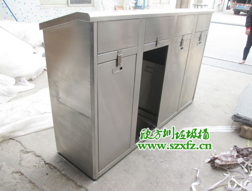 深圳師范學(xué)院附屬中學(xué)款式的C170五分類環(huán)保回收箱規(guī)格為:1600*400*860mm.外表是一款全新不銹鋼材質(zhì)打造而成.不銹鋼垃圾桶頂部有五個垃圾投放組合,圓形垃圾投口分別左,右,中間,還有兩個半圓在中間部位。不銹鋼垃圾桶正面開有五個門,每一個門前都有一個小鑰匙配套開門。正面中間橫幅有LOGO的標(biāo)準(zhǔn),還有深圳大學(xué)師范學(xué)院附屬中學(xué)字樣及英文拼音字母組合而成。不銹鋼垃圾桶五個取放垃圾內(nèi)膽正門,絲印有五個垃圾投放標(biāo)志。從左到右依次回收塑料罐,金屬罐,利樂包,紙張,有害垃圾及標(biāo)志。不銹鋼垃圾桶外觀為方形,具有獨(dú)特的堅(jiān)固耐用,不易破損;耐火安全,抗高低溫等優(yōu)勢。適合各大院校,高檔場所使用。