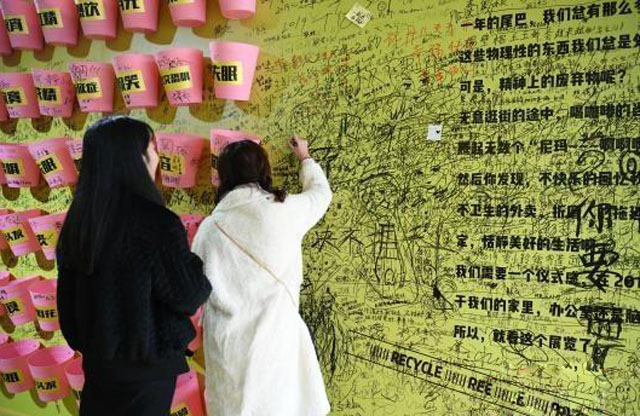 除了這些垃圾收集裝置,垃圾箱內(nèi)的三面?zhèn)葔偷孛嬉渤蔀槭忻裥沟钠脚_,寫滿了戳心的留言。如“扔掉和我媽的溝通不暢”“2018我抑郁癥了,話更少了,希望你不要離開,一起去馬來西亞”……字字句句都反映出當代年輕人的生活壓力,以及對輕松、快樂的渴望。