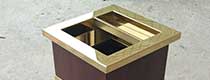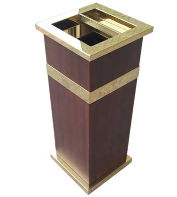 • 產品材質:酒店鈦金垃圾桶采用不銹鋼鋼板拉絲咖啡色或玫瑰金制作而成,另產品可做四面大理石用鋼板螺絲固定于桶體,有內桶,方便提倒垃圾,桶頭煙灰盅可放白石子可清洗,鋼板經折彎沖壓一次性成型。產品一律用室外粉靜電噴塑,經過180°的高溫,延長垃圾桶使用壽命,顏色持久不變亮麗如新。