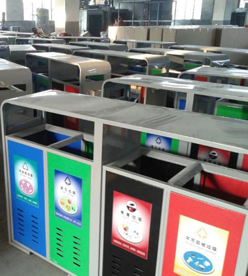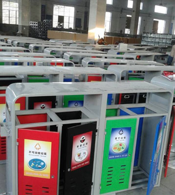 戶外鋼制四分類垃圾桶工廠批量生產圖
