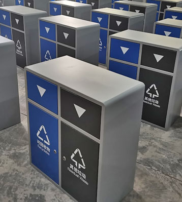 方形外觀兩分類(lèi)垃圾投放口,欣方圳采用激光切割焊接成型,邊角精細(xì)打磨拋光,配鍍鋅內(nèi)桶防銹耐腐蝕,桶身分類(lèi)標(biāo)識(shí)醒目,戶(hù)外塑粉表面烤漆工藝戶(hù)外防銹不褪色耐用。