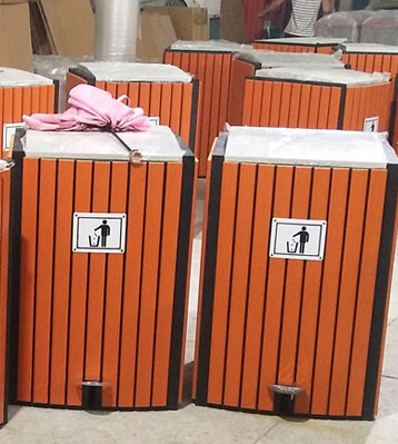 欣方圳戶外鋼木腳踏式垃圾桶原材料采用真空泵排除空氣、填充防腐液、加壓滲透、抽真空排出多余防腐液達到先進的防腐防蟲工藝。